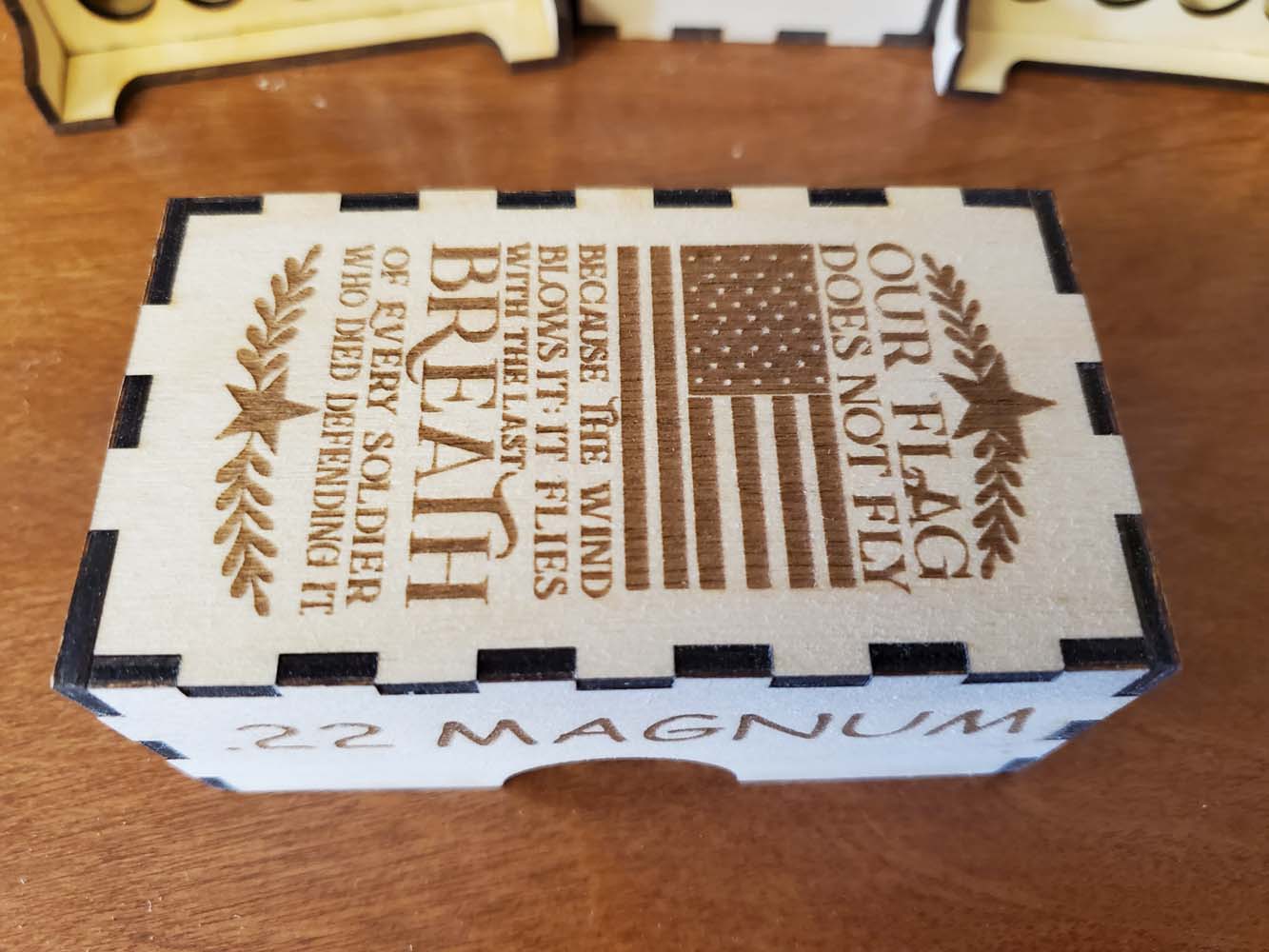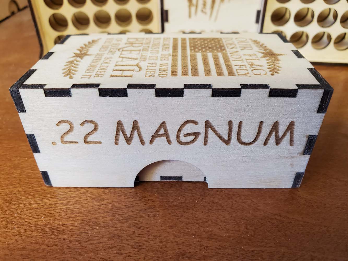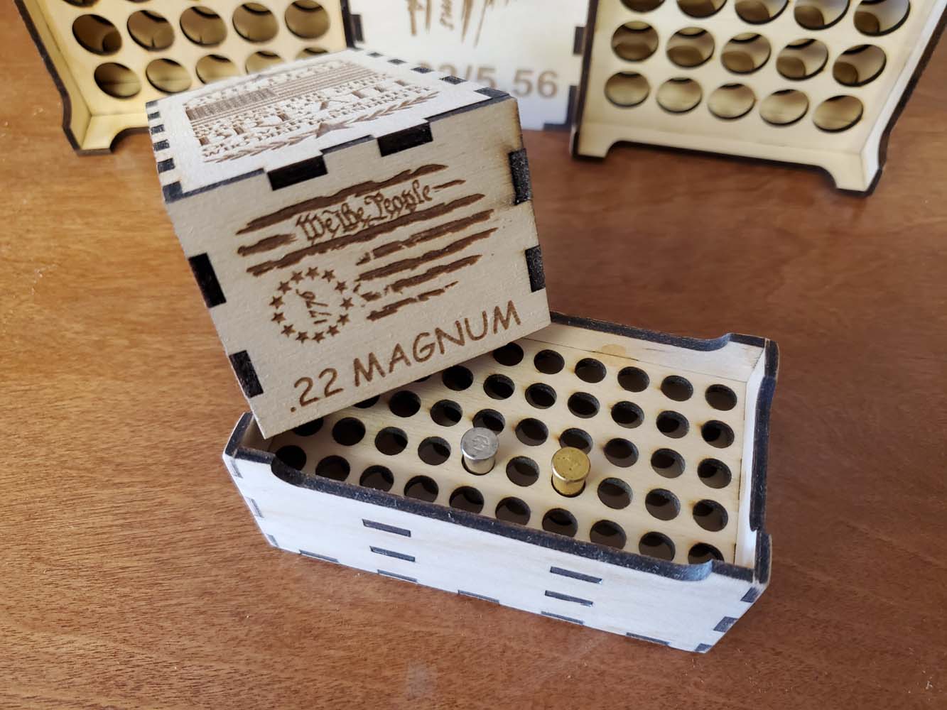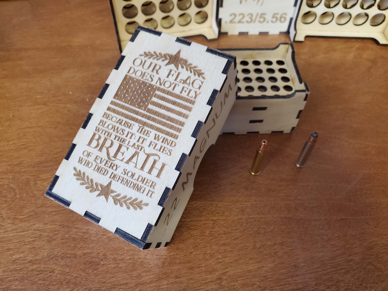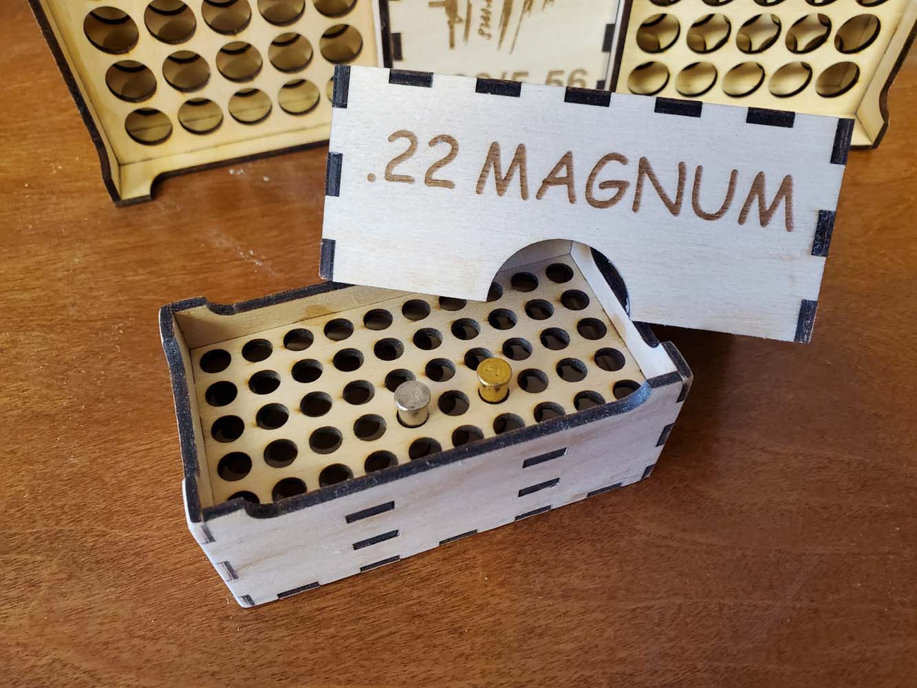 Securely holds 50 rounds. Crafted from 3MM baltic birch plywood. The ammunition in the pictures are for illustration purposes only. No ammo is shipped with these boxes.