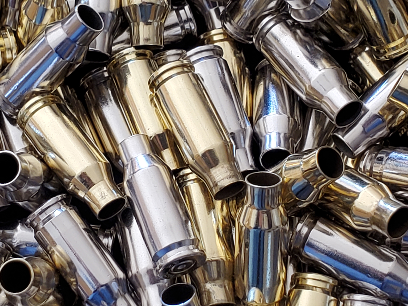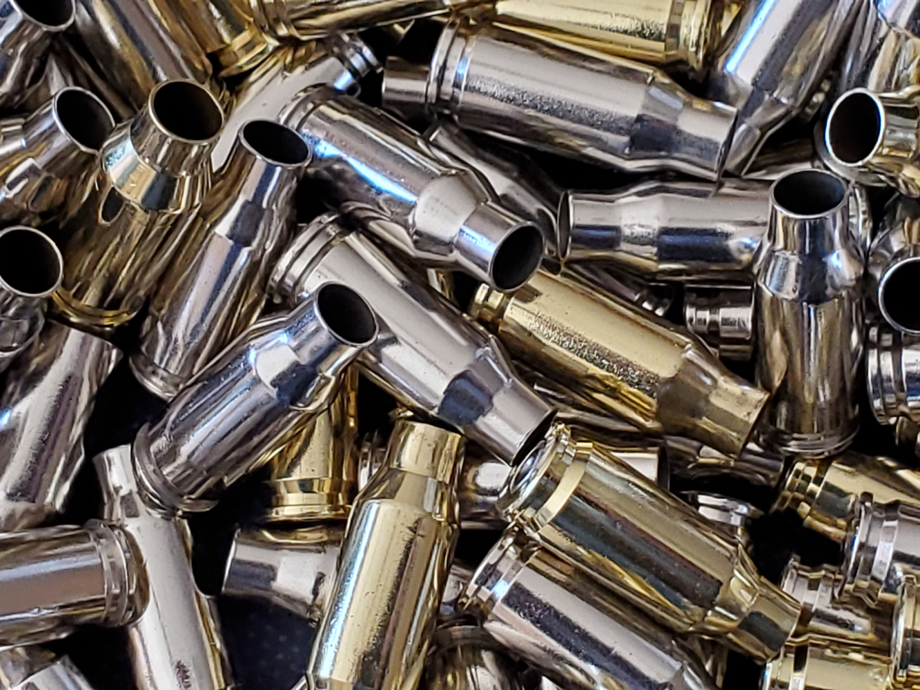 22 TCM Once Fired Brass is NOT cleaned and polished. It is not processed. The spent primers are in place. It consists of mixed head stamps.