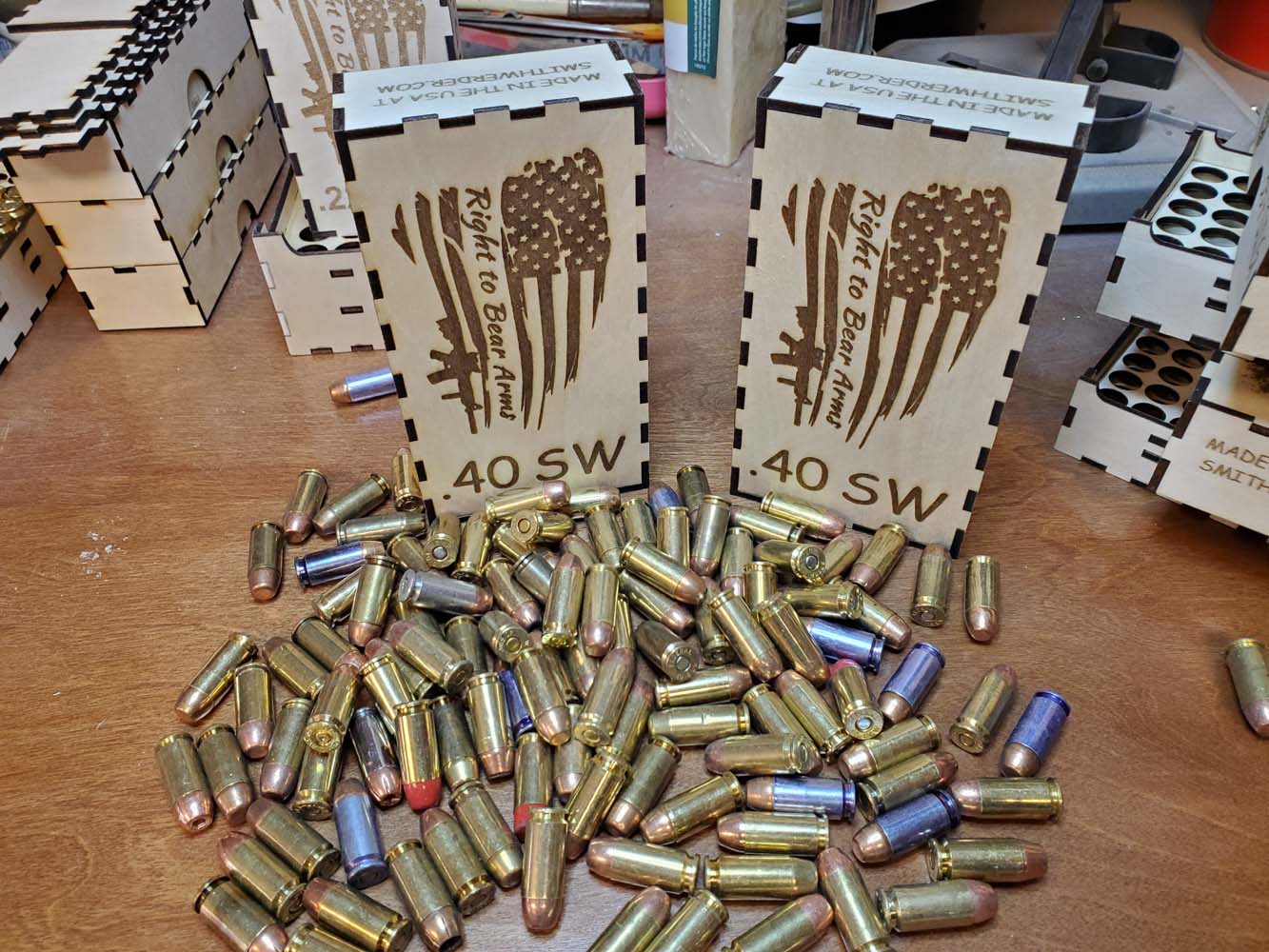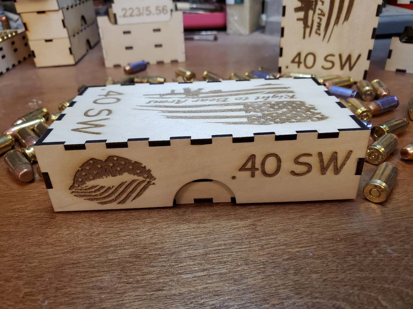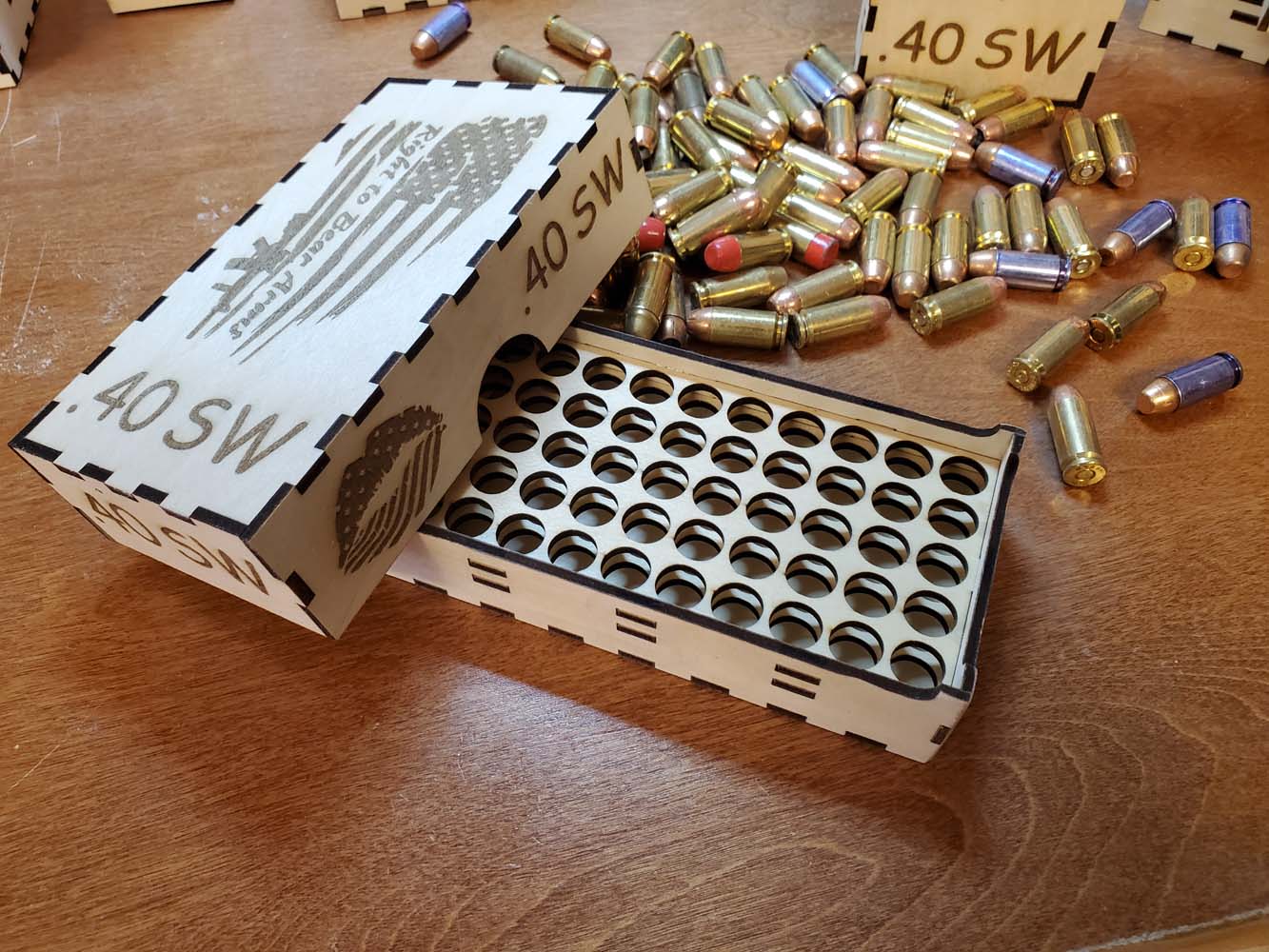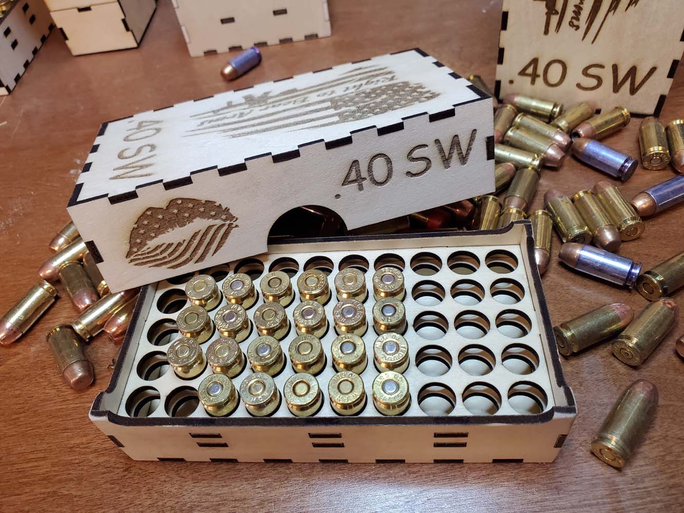 Securely holds 50 rounds. Crafted from 1/8 bass plywood. The ammunition in the pictures are for illustration purposes only. No ammo is shipped with these boxes.