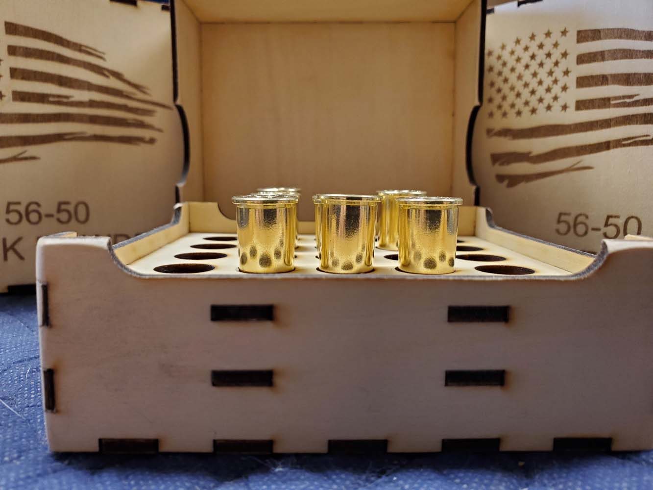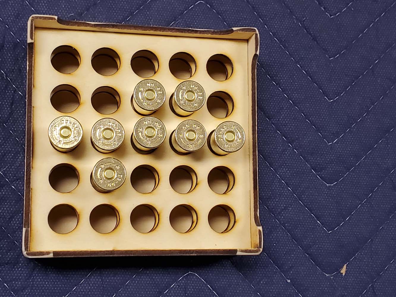 Securely holds 25 rounds. Crafted from 3MM baltic birch plywood. The ammunition in the pictures are for illustration purposes only. No ammo is shipped with these boxes.